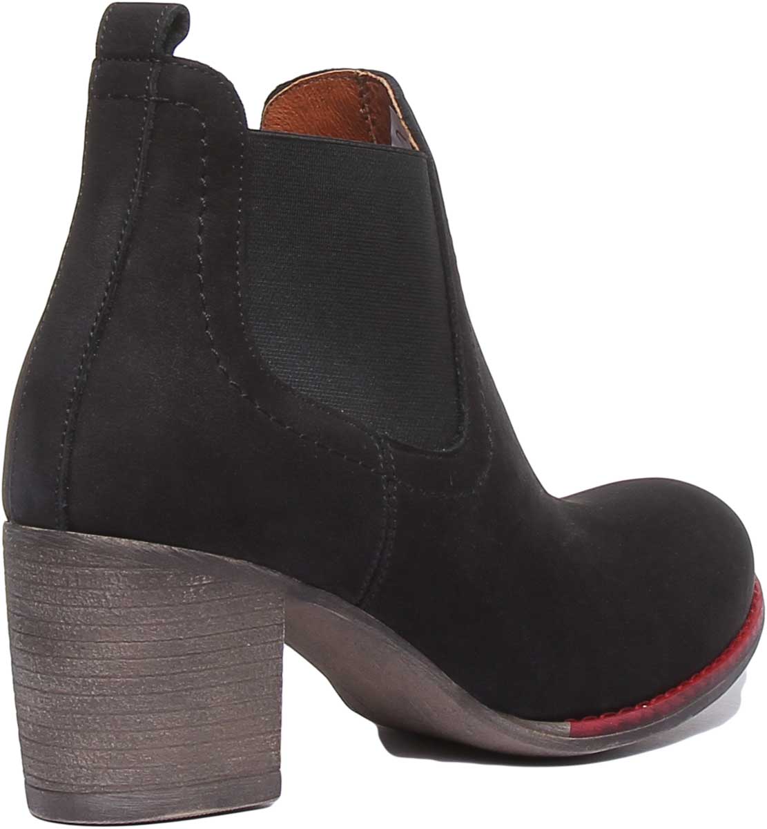 Put your best foot forward in these strikingly cool leather chelsea boots from Justin Reess. It features nubuck leather upper with leather lining and sole with wooden effect that provides comfortable fit. Patterned mid block heel adds an extra height that gives elegance and style to the whole boot. It comes with elasticated sides to ease foot entry. These boots are made to compliment any casual outfit.