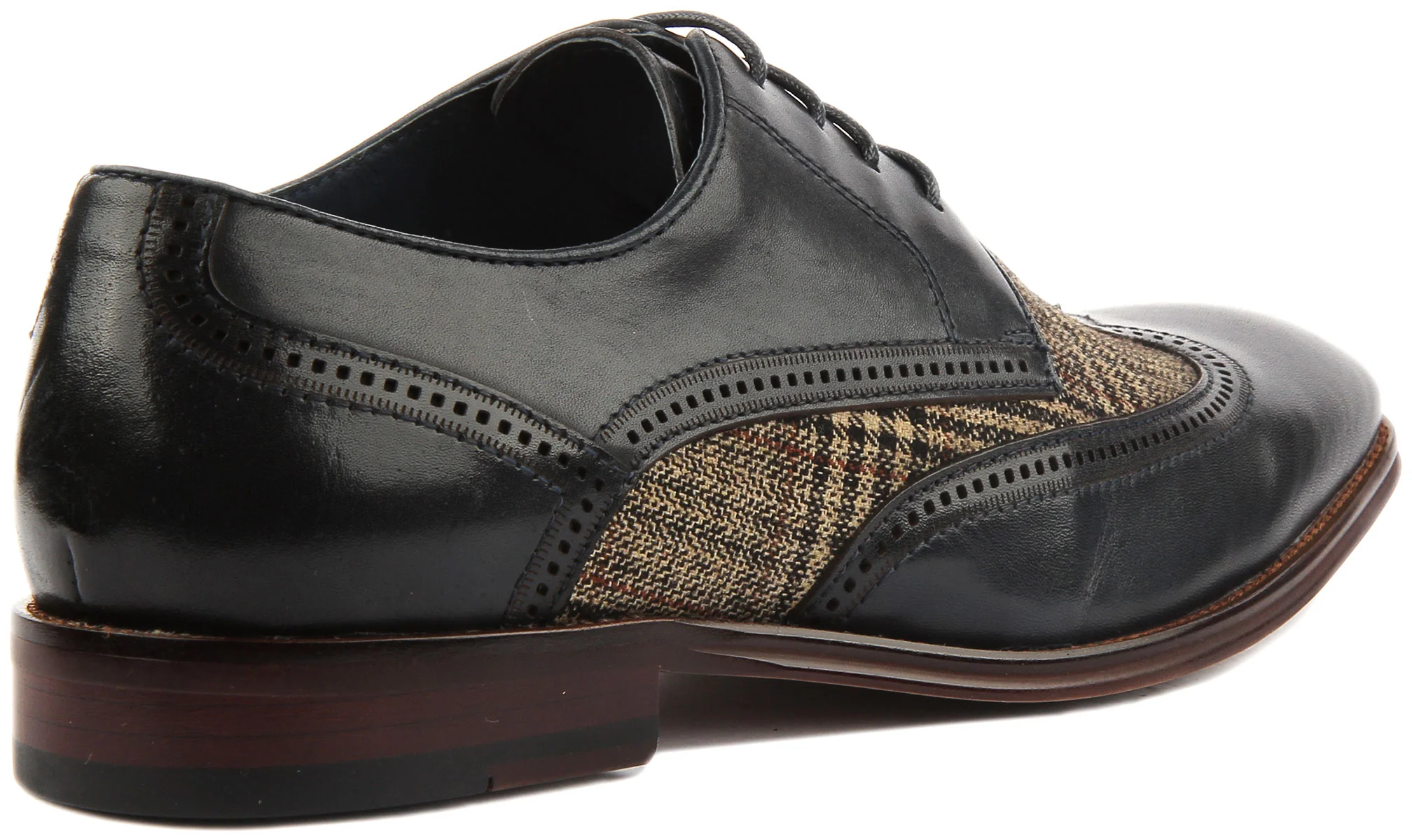 Justin Reess Curtis leather shoes with chisel toe and two tone fabric parts. This statement shoe features lace up closure for a secure fit. This classic design mixed with different textures is not only very appeasing to the eye, but it is also perfect for events that you want to impress. Featuring punched detailing and a ridged synthetic outsole, these are reliable and stylish shoes that will not let you down.