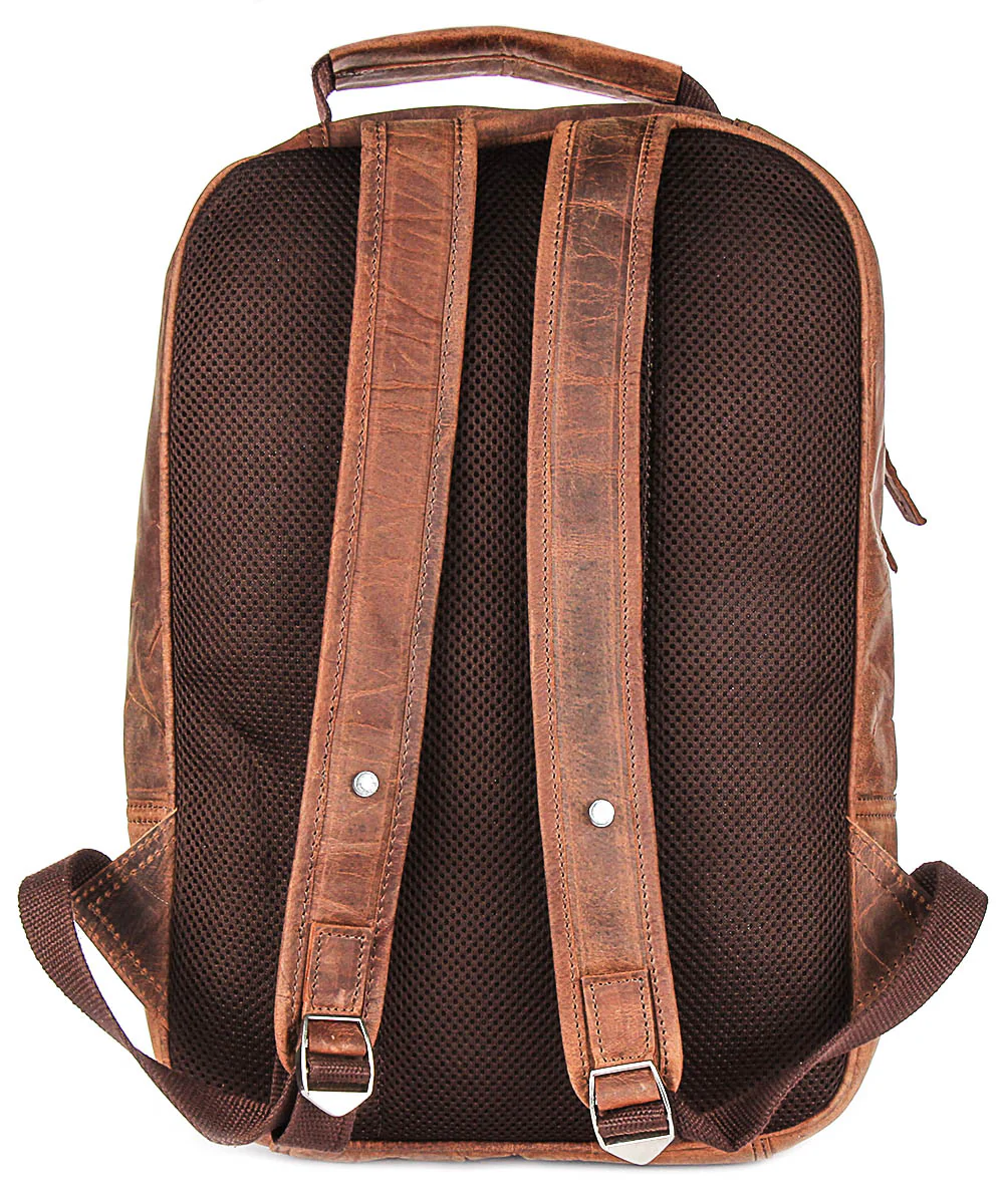 The rear side of the backpack is lined with breathable mesh padding, ensuring comfort while carrying it for extended periods. The adjustable leather shoulder straps offer added support and flexibility, and the top leather handle provides another convenient carrying option.