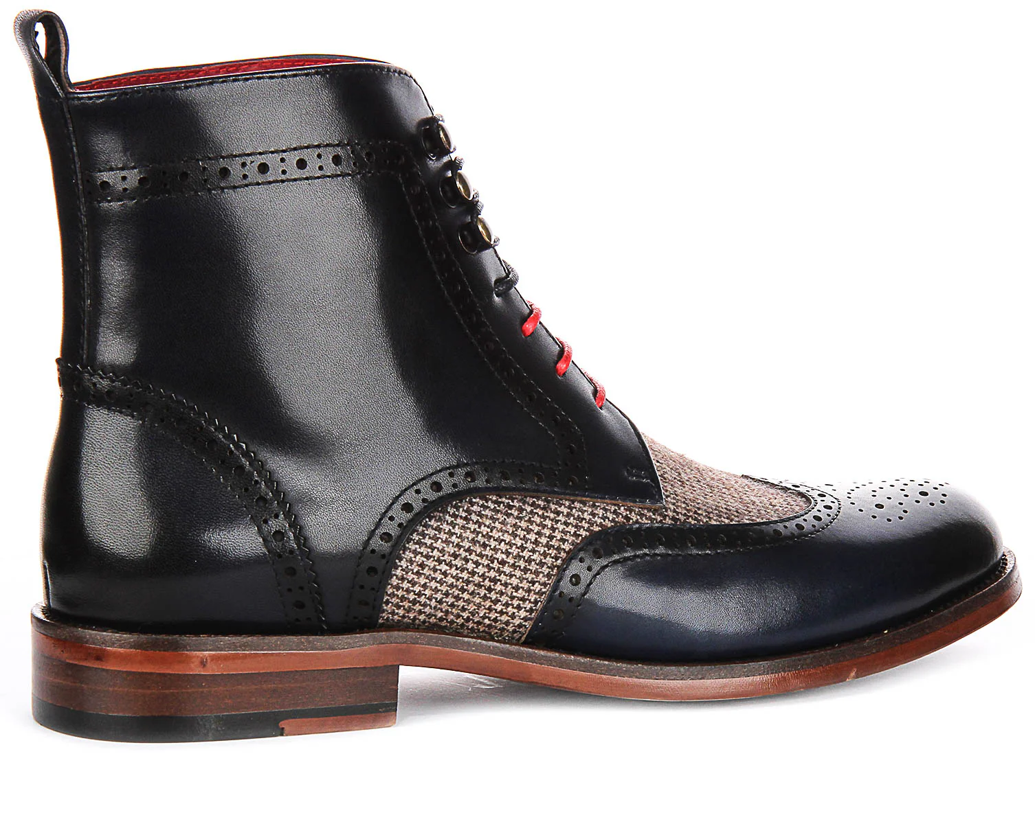 The boots are designed with meticulous attention to detail, evident in the intricate brogue detailing on the leather. The combination of dark leather and lighter, patterned canvas creates an eye-catching contrast that stands out. The boots are equipped with laces that include a striking pop of red, adding a bold twist to the traditional lace-up design.